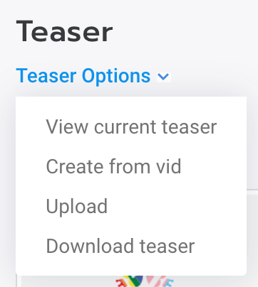 Once a teaser is generated or uploaded, you will have new options available under the 'Teaser Options' dropdown menu.The <View current teaser> option allows you to review your Teaser to ensure that it's exactly the way you want it, and the <Download teaser> option lets you download the teaser which can be great for promotional use!