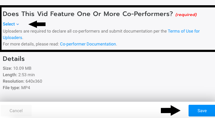 You will then need to navigate to the vid's Edit Page where you will declare whether the uploaded vid features one or more co-performers. If your vid features other performers, you will need to follow the directions to upload your co-performer documentation.