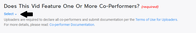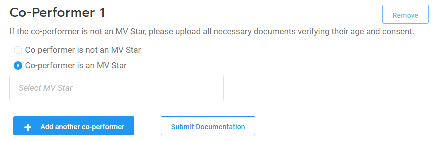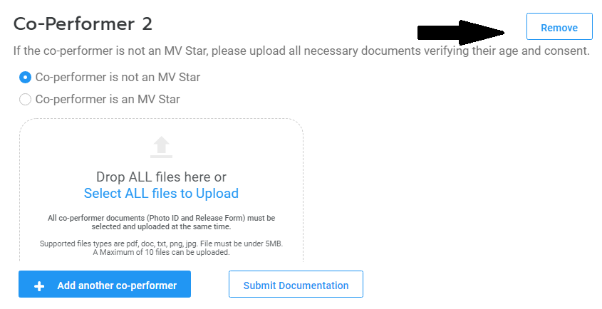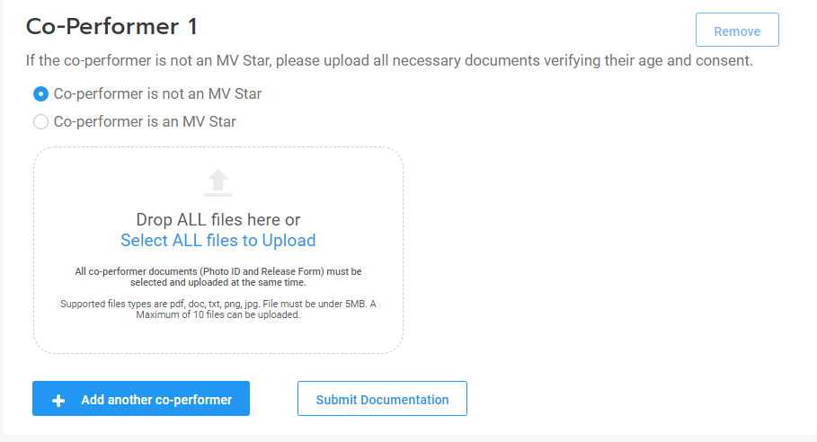 For vids that do not feature Creators, you will need to upload the required co-performer documentation for your co-star(s). Simply, select and upload all the documentation for the featured performer, in one go. If you have more than one co-star, click on, "Add another performer" to upload the next performer's documents. You can find details about our co-performer documentation in the article: Co-performer Documentation