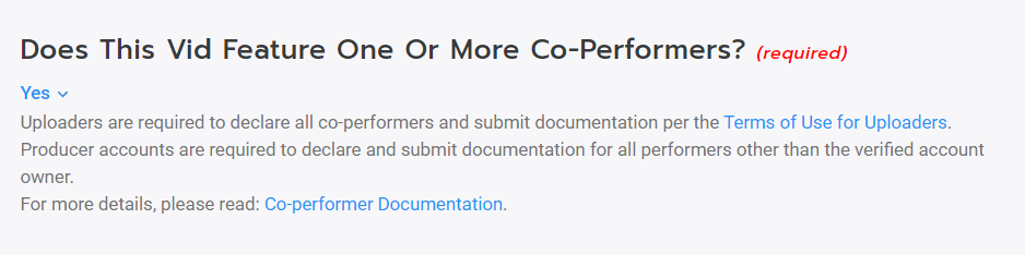 All Creators are required to declare their co-performers and submit their co-performer documentation when uploading content.