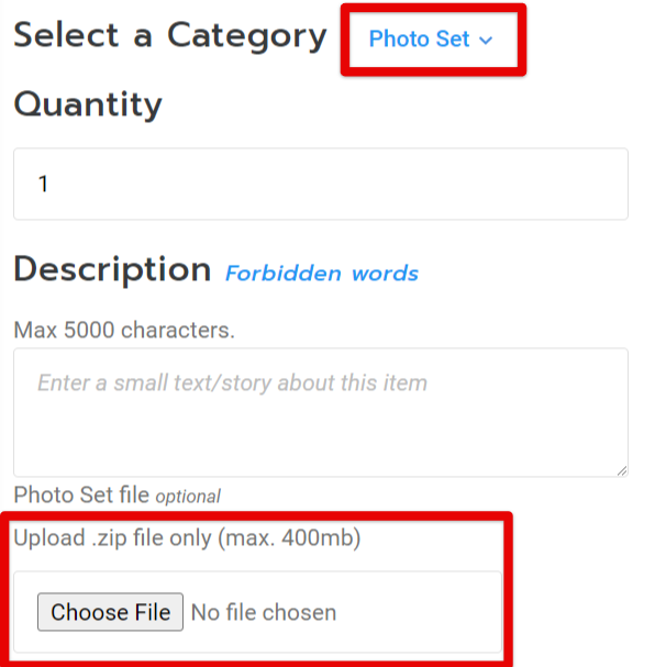 Select "Photo Set" as your category, then hit "Choose File" to add a .zip file containing all the photos included in the purchase. If your photoset is over the maximum, you'll need to deliver it to the Member directly via site PM. You can find allowed filesharing services here.