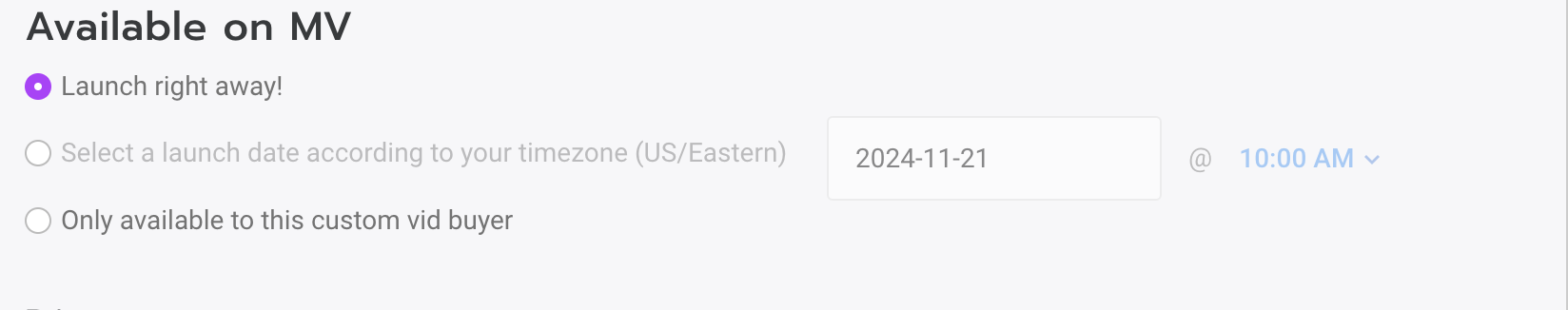 By default, the vid will not publish to your page and will only be available for the purchasing member. If you want to also publish the vid to your profile for purchase by others, scroll back up and select 'Launch right away!' under the 'Available on MV' section and add a Price.