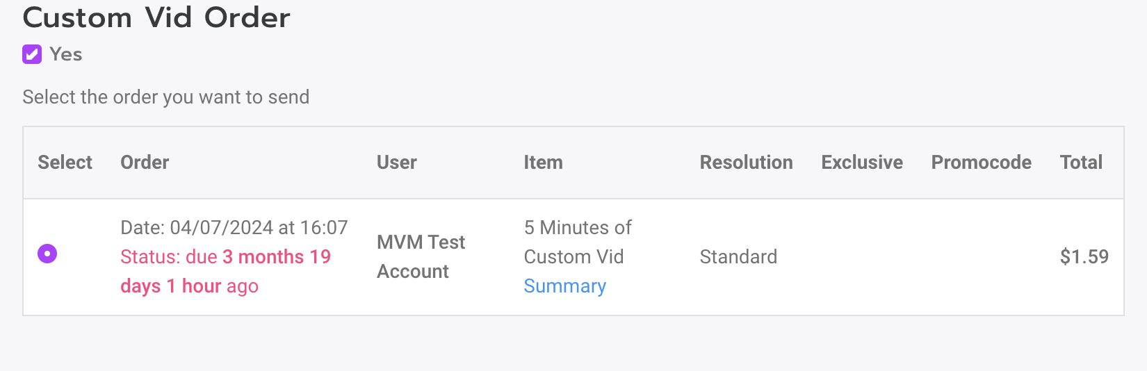 Once you click <Yes>, this opens up all your pending custom vid orders. Locate the username of the member you are sending the vid to and select them.