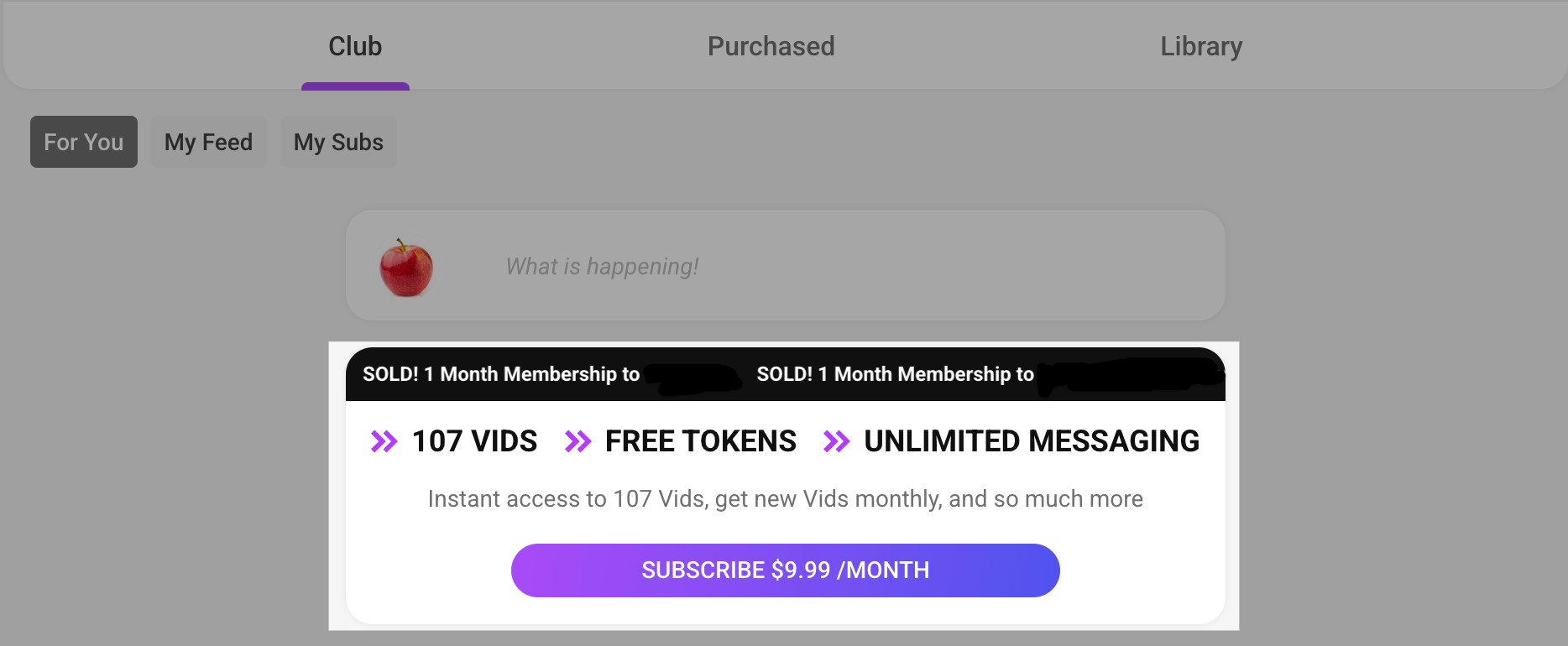 Alternatively, you can upgrade by clicking the Premium Promo box located under the 'Club' and 'Purchased' tabs on your profile, as seen below: