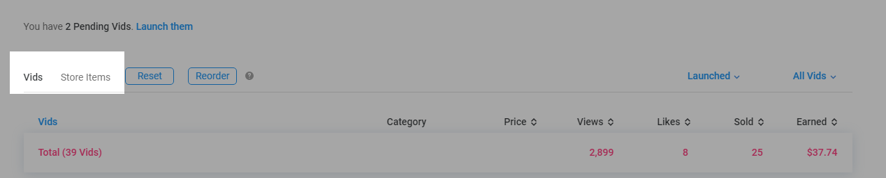 - If you are looking for a vid then make sure to have “Vids” selected at the top of this section; for store items select “Store Items”: