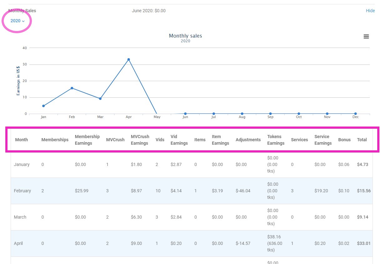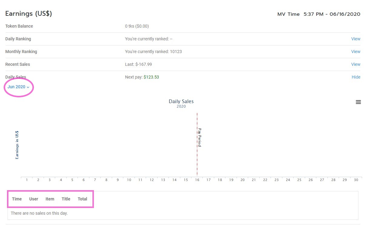 The Daily Sales will show you all of your profile's sales for the current month with an itemized breakdown of sales in the table below.