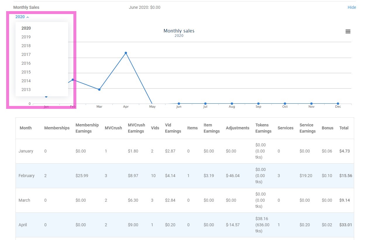 Along with seeing a breakdown of the types of sales per month, you may also re-visit your sales from previous years by clicking on the drop-down of the year on the upper left hand corner of the graph.